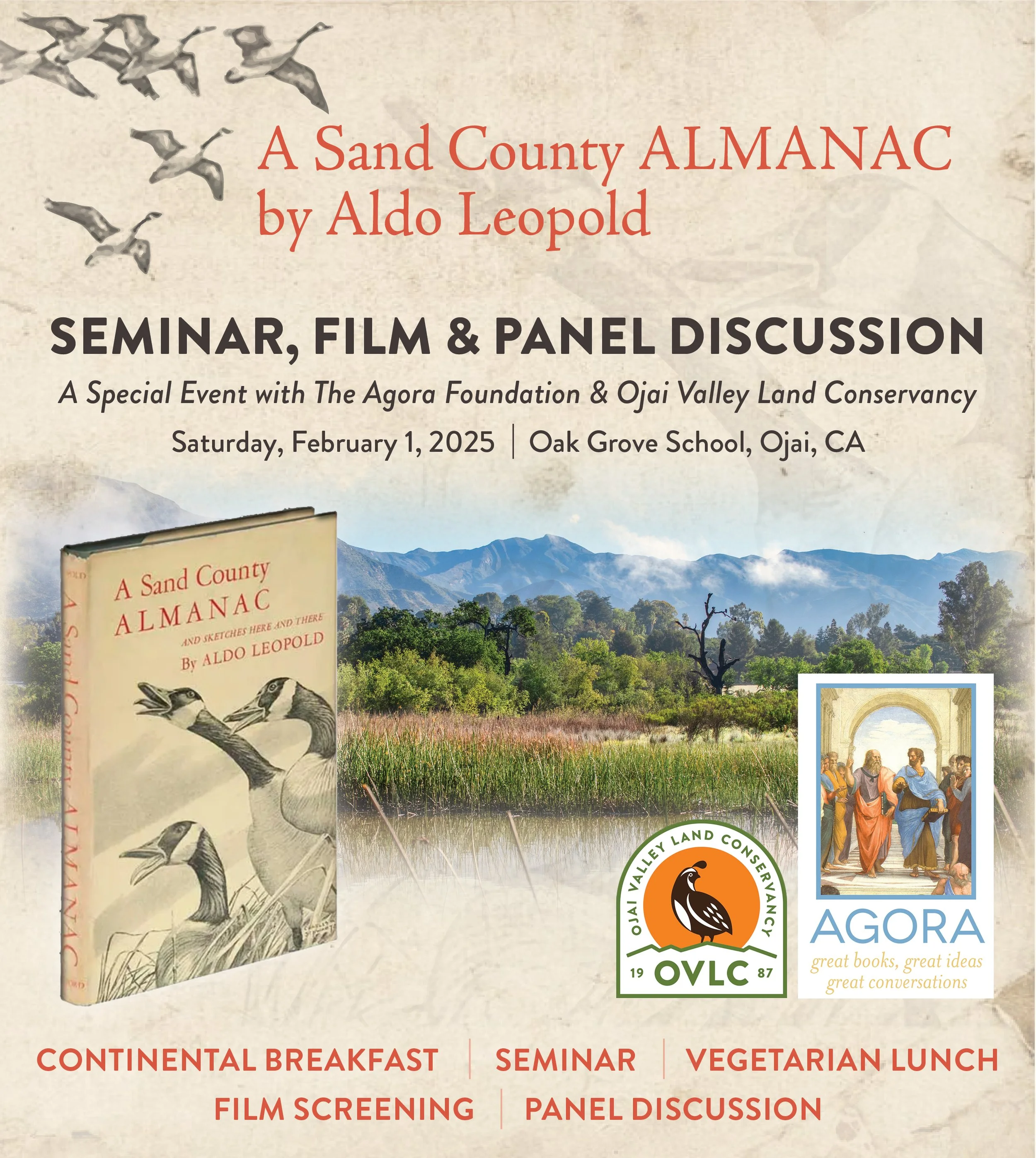 OVLC is partnering with the Agora Foundation for a one-day celebration of Aldo Leopold’s A Sand County Almanac. Join us at Oak Grove School on Saturday, February 1 for this inspiring event as we explore Leopold’s enduring legacy in conservation. Begin the day with a continental breakfast, followed by insightful presentations and a seminar exploring Leopold’s land ethic. Enjoy a vegetarian lunch, then immerse yourself in an afternoon film screening and a panel discussion on Leopold’s legacy and its relevance to Ojai’s conservation efforts. Presenters and panelists include Andy Gilman (AF), Jon Christensen (UCLA), Richard Knight (CSU), Roger Essick (OVLC), and Tom Maloney (OVLC).
