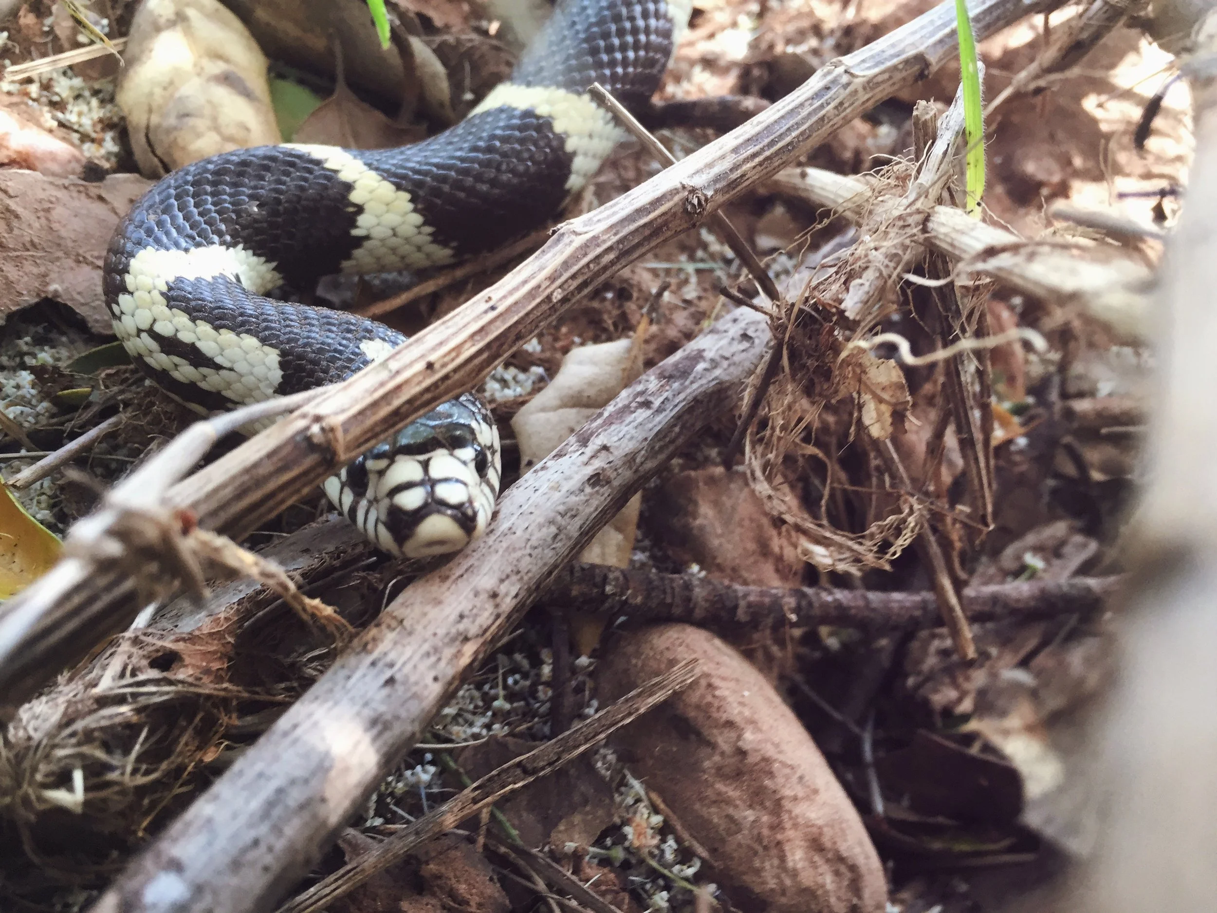 Whispers of scales sliver through wildflower duff, like a knitting pin through soft alpaca wool. Weaving between woodlands, thickets of shrubs and across open grasslands, the California kingsnake embodies transformation and persistence. Characterized by an absence of hind limbs, a reduced left lung, and lack of premaxilla teeth, colubrids such as the California kingsnake move around open areas between large shrubs and grasses, hunting for small mammals like rodents, amphibians such as frogs and even other snakes, including rattlesnakes. They are an indicator species of ecological stability and their presence is reflective of a healthy diversity of ecotones, or mixed habitat types. You might find them in Wills and Rice canyons, where a large variance in canopy cover occurs.