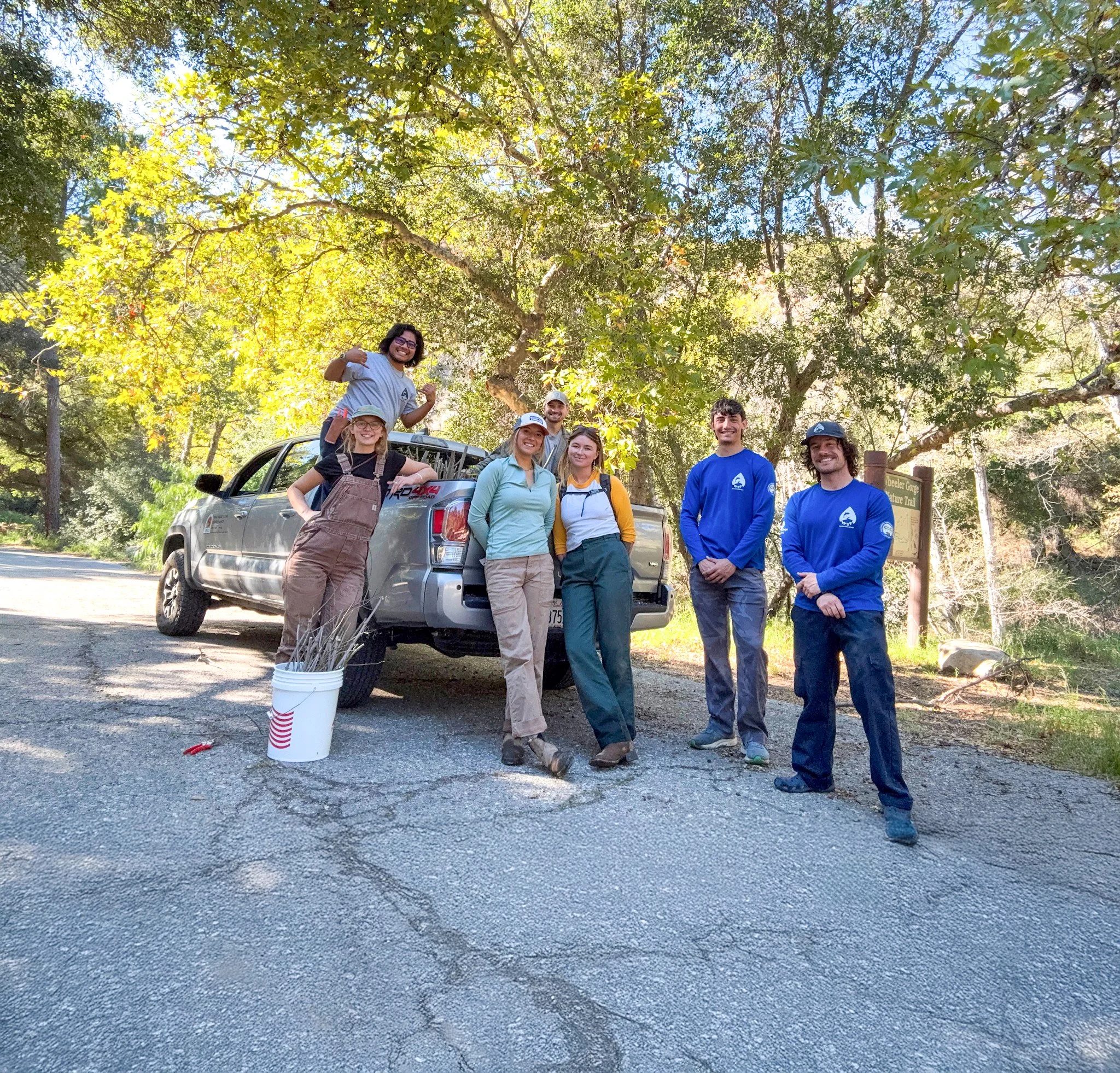 WSP Corpsmembers Dylan Hansen and Alex Dixon with OVLC’s restoration team at Wheeler Gorge Campground, preparing for a day of habitat restoration to improve fish passage on the North Fork of Matilija Creek.