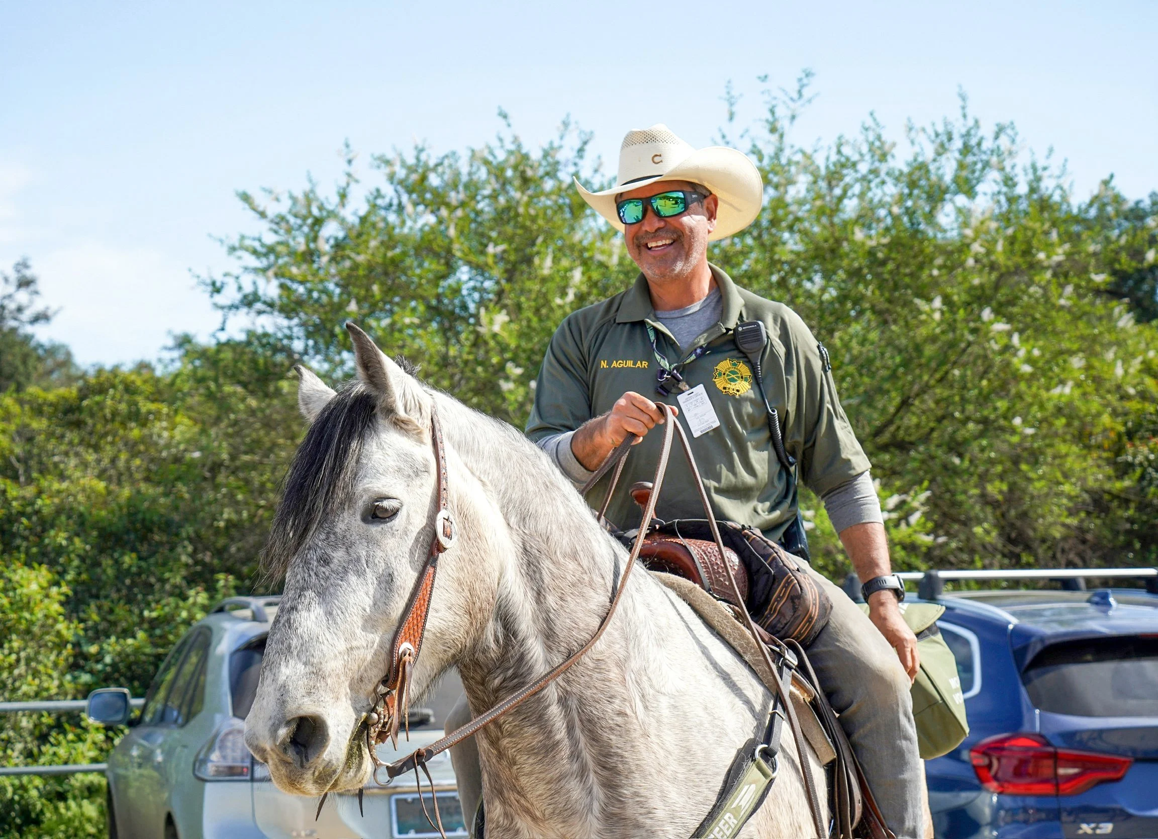 If you’ve visited the Ventura River Preserve recently, you may have seen riders on horseback patrolling the trails. Noel Aguilar, a volunteer with the Ventura County Sheriff’s Office Mounted Enforcement Unit (MEU), is helping lead a new effort to bring mounted patrols to OVLC preserves. Along with other MEU volunteers, Noel helps provide a welcoming presence for visitors—sharing trail information, encouraging responsible recreation, and keeping an eye out for potential safety concerns. OVLC’s Preserve Manager Linda Wilkin spoke with Noel about his lifelong passion for horses, his work rescuing mustangs, and how mounted patrols can help steward the Conservancy’s land.