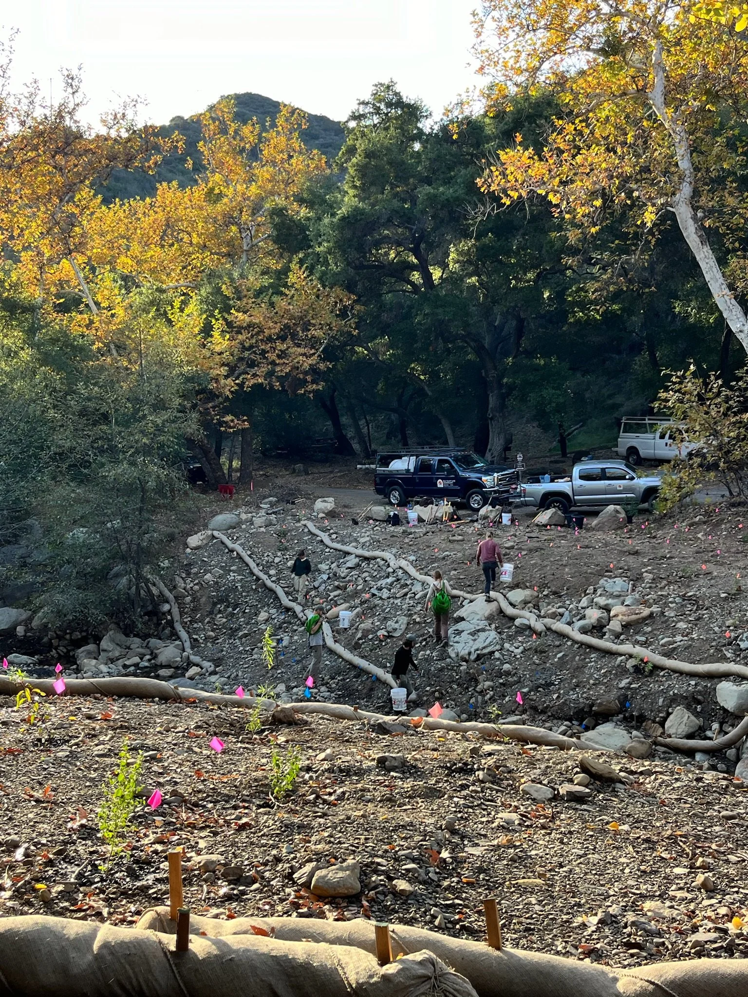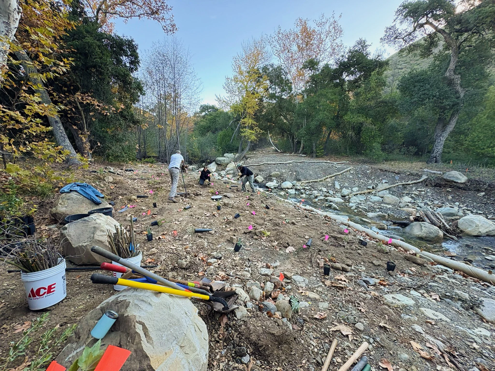 OVLC’s restoration team planted native vegetation along the North Fork of Matilija Creek after bridges replaced old crossings at Wheeler Gorge Campground—reopening habitat for steelhead.