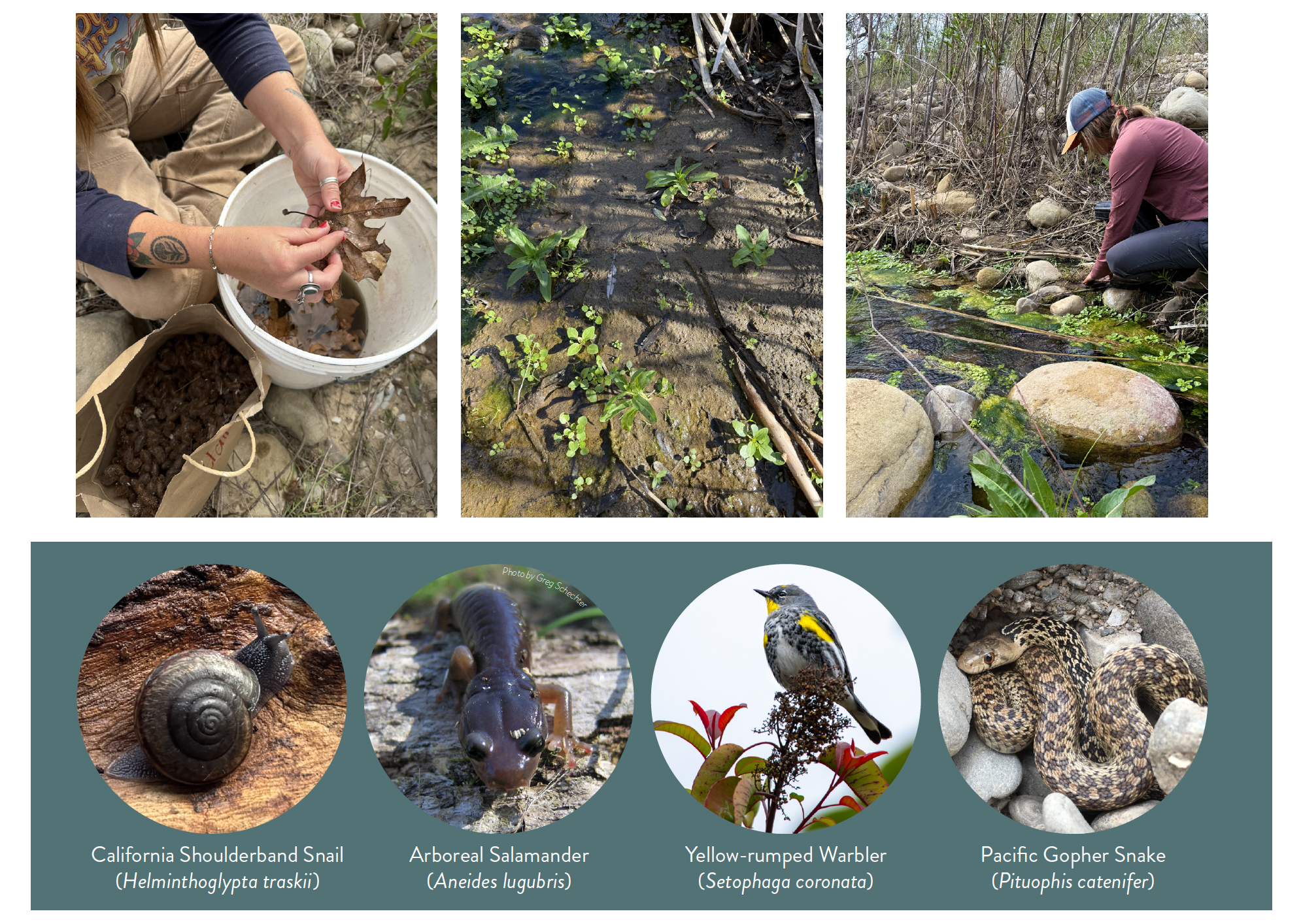 During our active restorations, we’ve encountered numerous microclimates, each unique with their vegetation communities, each with their own distinctive species palette. Upstream from Camp Comfort, beautiful old-growth forests nestle along the sandy banks of San Antonio Creek, teeming with animals and fungi alike. To name a few, we discovered an incredible amount of southern California shoulderband snails (Helminthoglypta traskii), emerging from their leafy hides during evening rainfall in search of a fungus feast. Scattered throughout this reach, we noticed fungal caps poking out of the leaf litter in various colors, shapes, and sizes. Mushrooms are not only a treat to find, but a large mycelial network is a huge indicator of a healthy riparian woodland. These moisture-rich riparian woodlands support another elusive species that we hope to promote a thriving habitat for, the arboreal salamander (Aneides lugubris). Arboreal salamanders are unique in their preference for nooks and calluses of old growth riparian trees, often sycamores or oaks. When we think of success in our restoration areas, we envision them everywhere. These critters, along with many other wildlife species, are insectivores, meaning they depend on a slew of insects to survive. Re-establishing our biological communities restores the food web, from the smallest biota to the resplendent species we know and love.