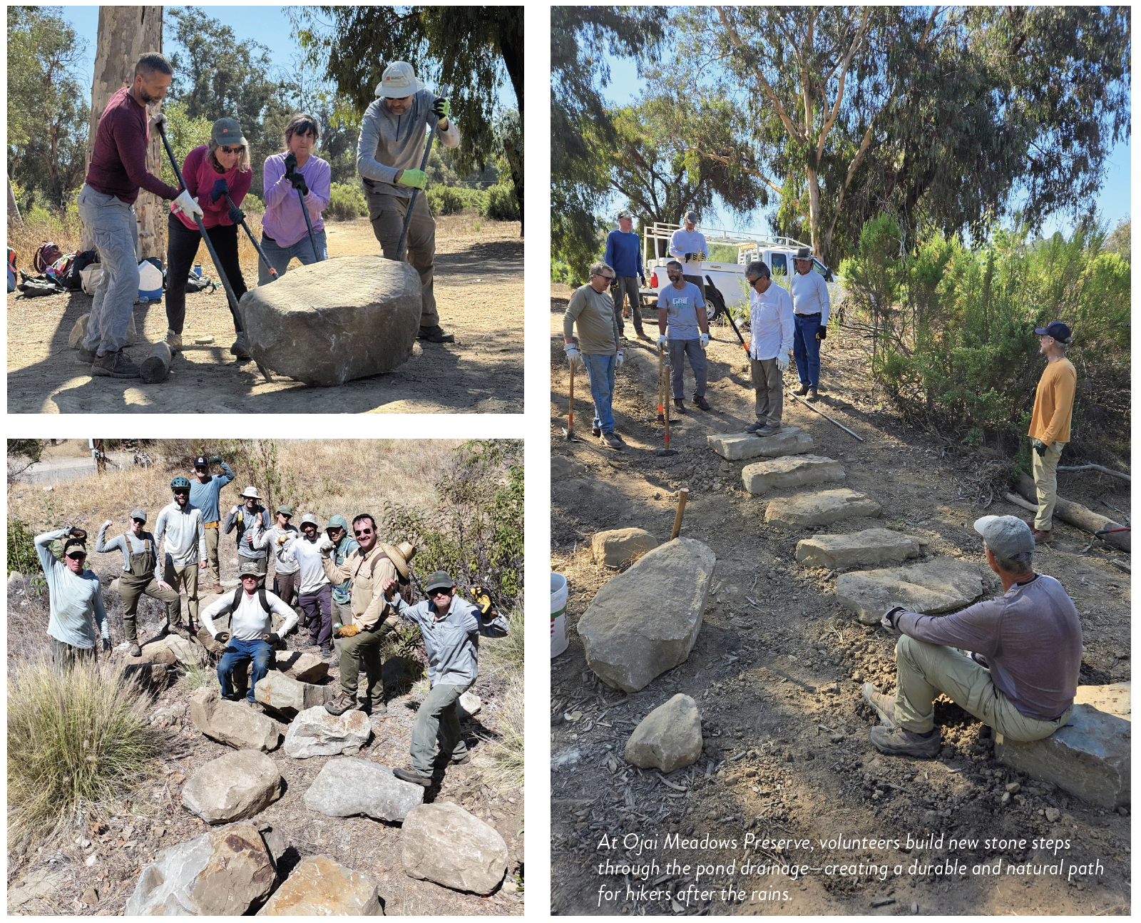 At Ojai Meadows Preserve, volunteers build new stone steps through the pond drainage—creating a durable and natural path for hikers after the rains.